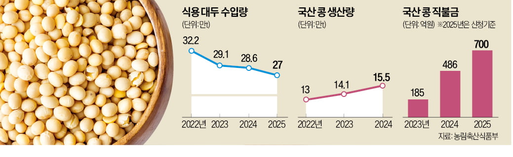 농식품부에 따르면 이달 기준 올해 수입 콩 공급량은 27만t 수준이다. 지난해에 비해 1만6000t 적다. 남아도는 국산 콩 사용을 장려하기 위해 정부가 대두 수입을 줄이고 있어서다. 내년엔 콩 수입량을 더 감축할 방침이어서 공급난은 한층 심해질 전망이다. 농식품부 관계자는 “올해보다 수입 콩 쿼터를 더 줄이는 대신 대기업 등 상위 업체를 중심으로 국산 콩 사용을 유도하는 방안을 검토하고 있다”고 말했다.