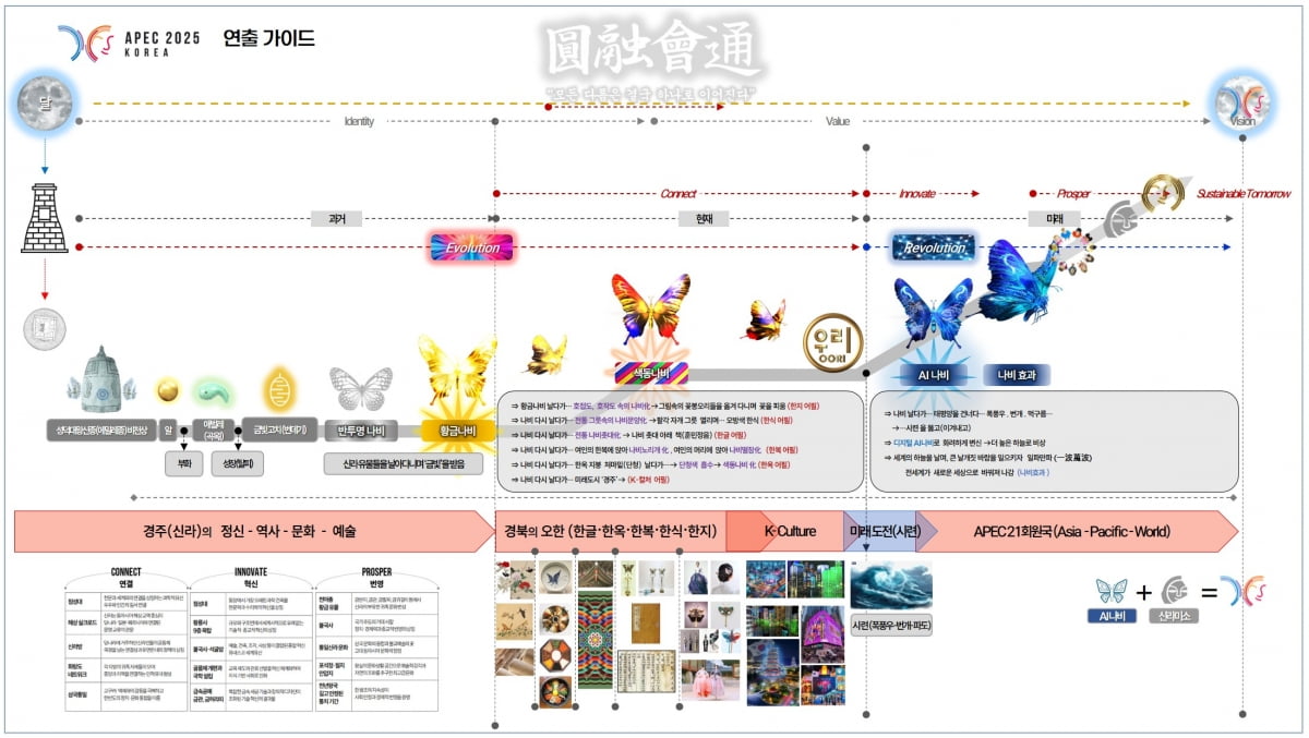 APEC의 주제였던 '연결·혁신·번영'의 키워드는 엠블럼의 상징인 '나비'가 대표했다. 신라의 황금 문화를 상징하는 '황금 나비'부터 K-컬처의 다양성과 확장성을 나타내는 '색동 나비', 미래의 전 세계적인 화합과 연대·연결을 의미하는 'AI 나비'까지 20분 분량의 영상과 멀티미디어들이 끊기는 구간 없이 매끄럽게 이어지며 대한민국, 나아가 세계의 화합을 이야기했다.