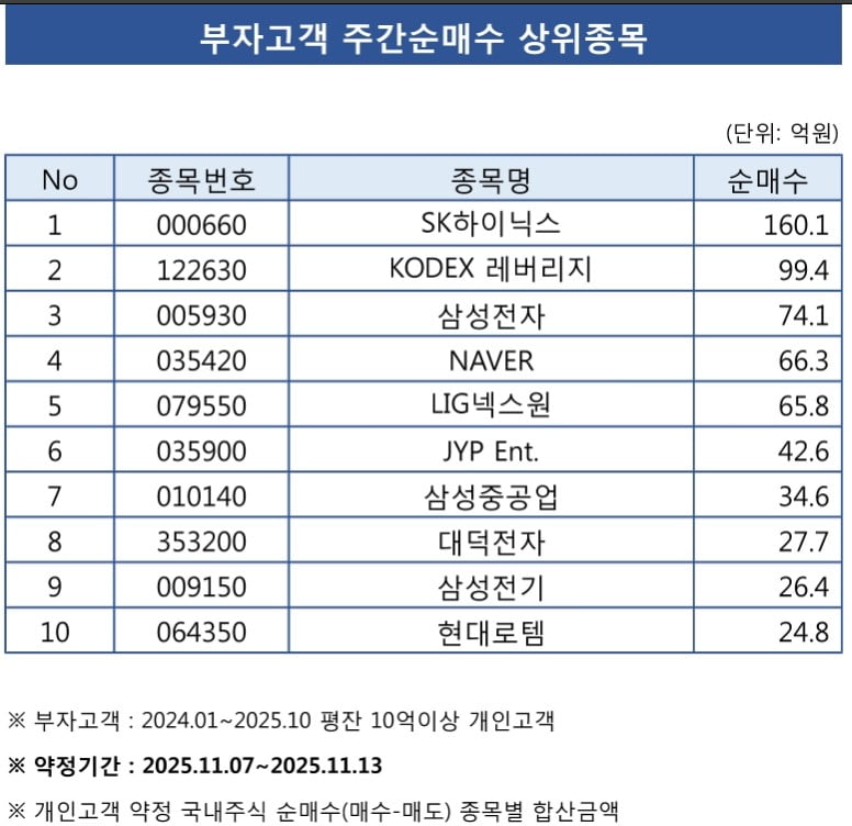 한국투자증권에 따르면 이 증권사 계좌를 이용하는 평균 잔액이 10억원 이상인 주식 투자자들은 지난 7일부터 13일까지 반도체 업종을 집중적으로 사들였다. 이 기간 SK하이닉스(1위)를 160억1000만원, 삼성전자(3위)를 74억1000만원어치 순매수했다. 2위는 KODEX 레버리지 ETF(99억4000만원)가 차지했다.