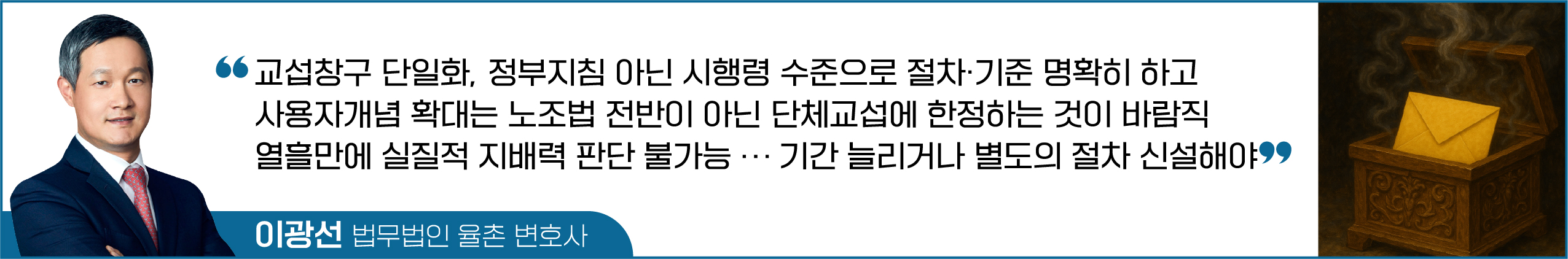 고대 그리스 신화에서 판도라는 인간에게 벌을 내리기 위해 만들어진 존재다. 제우스는 그녀에게 절대 열어서는 안 될 상자를 주었지만, 호기심을 이기지 못한 판도라가 그것을 열자 질병·전쟁·재앙이 세상으로 퍼져 나갔고, 맨 아래에는 ‘희망’만이 남았다. 이 비유처럼 ‘판도라의 상자’는 한 번 열리면 되돌릴 수 없는 위험을 뜻하면서도, 마지막까지 희망을 놓지 말아야 한다는 교훈을 함께 담고 있다. 이제 우리 앞에도 판도라의 상자가 하나 열리고 있다. 바로 최근 공포되어 2026년 3월 10일 효력이 발생되는 노란봉투법이다. 그러나 법 제2조의 정의 규정을 개정하며 사용자와 노동쟁의 개념만을 확대해 놓고, 이로 인해 발생할 실무적 잴점들에 대해서는 아무런 답을 내놓지 않았다. 이로 인해 현장에서는 법 시행을 앞두고 무엇을 준비해야 할지조차 몰라 우왕좌왕하고 있다. 정부는 노동부 지침이나 매뉴얼을 통해 구체화하겠다고 하지만, 개정된 노란봉투법에서는 시행령이나 시행규칙으로 위임하지 않았다. 결국 노동부의 어떤 지침이나 매뉴얼이 만들어지더라도 법적 근거가 없어 행정부의 해석에 불과하다. 노동부의 지침(매뉴얼)이 만들어지더라도 수많은 쟁점사항에 대해 정확한 답변을 줄 수 있을지도 의문이지만, 설령 정확한 답변을 제시하더라도 노사 어느 한쪽이 반발하며 불복할 가능성이 크고, 2026년 3월 10일 이후 줄소송이 이어질 위험도 존재한다.
