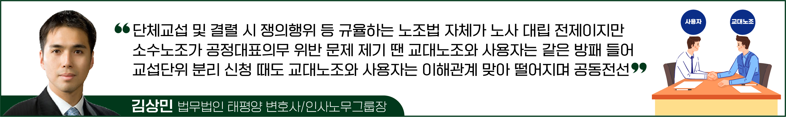 연쇄살인범의 표적이 되었다가 죽다 살아난 조직의 보스 장동수와 범인잡기에 혈안이 된 강력반 형사 정태석은 의기투합하여 공동으로 연쇄살인범을 잡기로 한다. 평소 으르렁거리며 적대적이던 두 사람이 연쇄살인범이라는 외부 변수에 의해 일시적으로 협조하며 뜻을 같이 하는 것이다. 영화 악인전의 스토리다. 노동조합법은 사용자 대 노동조합이라는 대항적 구조를 전제하고 있고, 실제로 단체교섭 현장, 단체교섭 결렬 시 쟁의행위, 기타 법적 분쟁 등 사용자와 노동조합이 충돌하는 영역은 매우 넓고, 노동조합법은 이러한 충돌을 전제하고 있다. 그런데 복수 노동조합 체제에서 교섭대표노동조합이 되지 못한 소수노동조합이 다양한 이슈를 제기하는 경우가 있고, 교섭대표노동조합과 사용자 모두를 직접 상대방으로 하거나 교섭대표노동조합과 사용자가 체결한 단체협약에 대하여 문제를 삼게 되면, 교섭대표노동조합과 사용자는 뜻을 같이 하여 대응하는 상황이 발생하다. 대항적인 관계에 있다가 같은 편이 되는 것이다. |