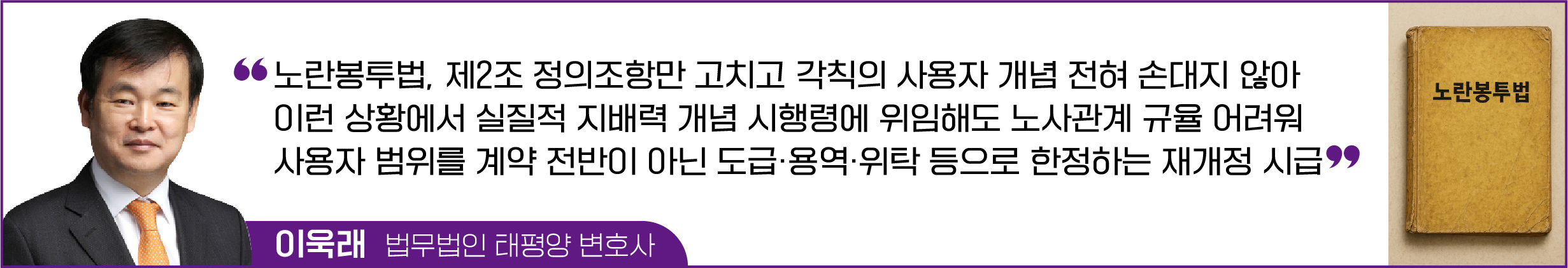 우리 노동조합법은 단순히 조문들을 열거하는 방식이 아니라, 법 개념을 정교하게 구성하고 그 상호관계를 명확히 하는 판덱텐(Pandekten) 체계로 되어 있다. 노동조합법 총칙에 해당하는 제2조 정의 조항을 개정하면 그 효과는 노동조합법 전체에 미치게 된다. 그런데 개정 노동법은 정의조항만 손대고 각칙은 전혀 손대지 않았다. 이런 상황에서 새로 추가된 사용자 조항을 아예 삭제하지 않고 실질적 지배력 개념을 구체화하는 구성요건표지를 규정에 포함하거나 시행령 등에 위임하더라도 기존 근로기준법상 근로관계 혹은 보다 넓은 노동조합법상 근로관계 등 양자 관계에 벗어난 노사관계의 통일적 규율은 난망할 것으로 보인다. 결국 개정 노동조합법상 사용자 범위를 도급, 용역, 위탁 등 계약관계 전반이 아닌 일부로 한정하여 그 부정적 효과를 다소라도 줄이는 내용의 재개정이 시급하다. 고용노동부도 입법 과정에서 기존에 소송에서 문제된 두 개의 주된 영역, 즉 사내도급과 택배사업에 한정하는 내용의 구체적 표지를 삽입하자는 노력을 하였으나 여당의 반대로 무위로 돌아갔다는 이야기를 들은 바 있다.