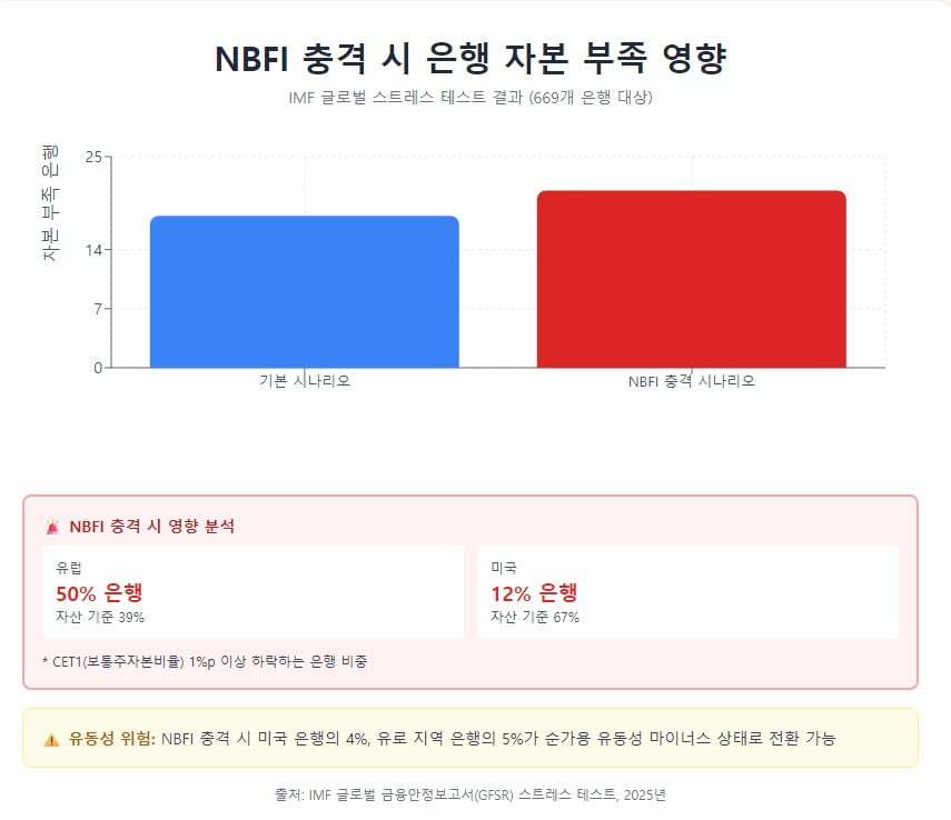미국에서는 이런 은행의 비중이 14%, 유로 지역에서도 5%까지 늘어난다. IMF는 “NBFI발 충격이 커질 경우 은행의 자본 건전성뿐 아니라 현금 유동성까지 동시에 흔들릴 수 있다”며 기업과 가계에 대한 대출이 막혀 실물경제 전체가 마비될 위험이 있다고 경고했다.