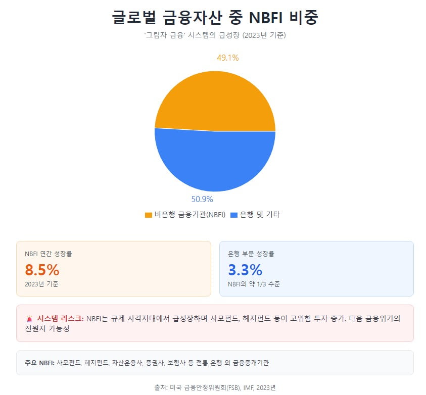 신용 중개 기능은 2008년 금융위기 이후 강화된 은행 규제(바젤 III 등)를 피해 사모펀드, 헤지펀드, 자산운용사 등 NBFI 부문으로 대거 이전됐다. 미국 금융안정위원회(FSB)에 따르면 2023년 기준 NBFI의 자산 비중은 전 세계 금융자산의 49.1%에 달한다. 연간 성장률은 8.5%로 은행 부문(3.3%)을 크게 앞질렀다. 유럽에서도 투자펀드 등 NBFI 자산은 작년 말 50조 7000억 유로로 사상 최대치를 기록했다.