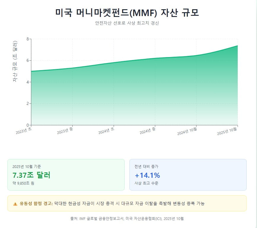 지난 15일 기준 미국 머니마켓펀드(MMF) 자산은 7조 3700억 달러로 사상 최고 수준에 근접했다. S&P500 지수가 사상 최고치는 경신하는 등 시장은 유동성 랠리를 이어가고 있다. 하지만 IMF는 이런 상황이 오히려 작은 충격에도 급격한 조정을 유발할 수 있는 ‘얇은 얼음’과 같다고 경고했다.