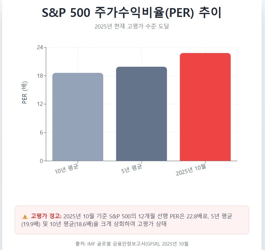 IMF는 현재 리스크 자산의 밸류에이션(가치)이 펀더멘털(기본 체력)을 "훨씬 웃도는 수준"이며 "다시 ‘스트레치드(Stretched·과도하게 늘어난)’ 상태로 회귀했다"고 평가했다. 이는 관련 지표로 확인된다. S&P500 지수의 12개월 선행 주가수익비율(P/E)은 10월 2주차 기준 22.8배였다. 5년 평균(19.9배)과 10년 평균(18.6배)을 크게 상회한다.