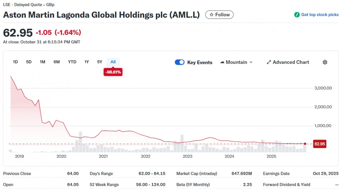 애스턴마틴의 주가는 상장 이후 줄곧 하락세입니다. 2018년 상장 당시 기업가치는 약 43억 파운드 수준이었습니다. 지난 10월 30일 주가는 62.95파운드에 시가총액은 6억4769만 파운드입니다. 상장 이후 7년간 무려 약 98.61% 하락했습니다. 참고로 같은 기간 경쟁사 페라리의 주가는 약 300% 올랐습니다.