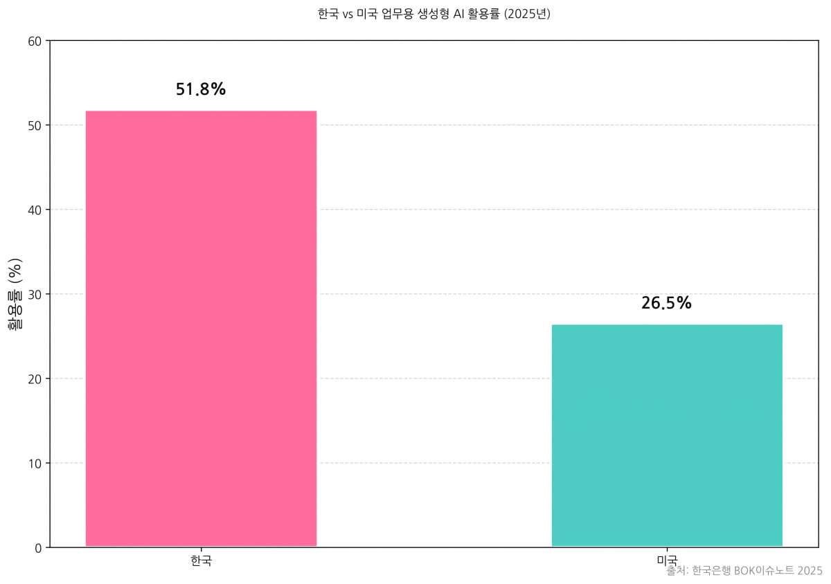 아이러니하게도 한국 직장인의 AI 수용성은 세계 최고 수준이다. 한국은행이 지난 8월 발표한 조사 결과, 한국 직장인의 업무상 AI 사용률은 51.8%로, 미국(26.5%)의 거의 두 배에 달했다. 주간 사용 시간이나 '헤비 유저'(매일 1시간 이상 사용) 비율 역시 미국을 압도했다. 한국은 AI 기술을 받아들이는 속도가 매우 빠르다는 것을 보여준다.