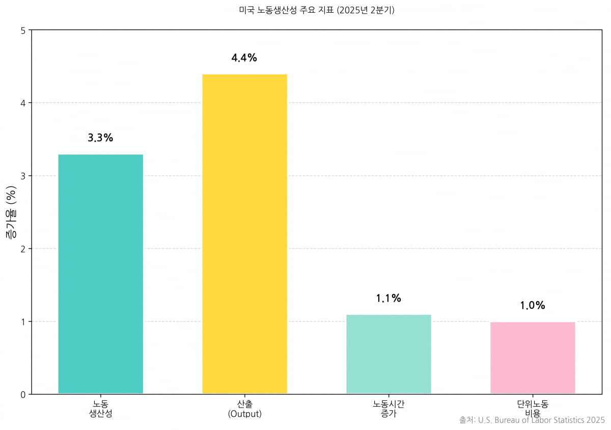 세부 지표를 보면 생산성 상승의 구조가 뚜렷하다. 총산출(Output)은 4.4% 증가했지만, 투입된 노동시간은 1.1% 늘어나는 데 그쳤다. 기업들은 같은 인력으로 훨씬 더 많은 재화와 서비스를 만들어냈다는 뜻이다. AI 기술이 데이터 분석과 예측 모델링, 업무 자동화 등을 통해 의사결정 속도를 높이고 비효율을 제거하면서, 기업 전체의 운영 효율이 눈에 띄게 개선한 것으로 보인다.