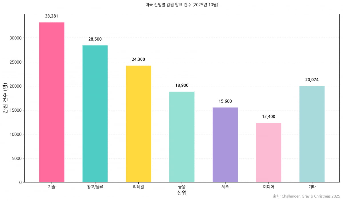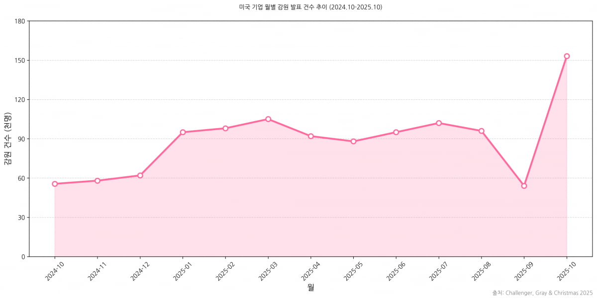 하지만 이런 기업들의 화려한 실적 이면에는 차가운 그림자가 드리워져 있다. 주식 시장이 뜨겁게 달아오르는 동안, 노동 시장은 정반대의 방향으로 급속히 식어가고 있다. 글로벌 고용 컨설팅 기업인 챌린저, 그레이 앤 크리스마스(챌린저)가 지난 6일 발표한 보고서에 따르면, 지난 10월 한 달 동안 미국 기업들이 발표한 감원 건수는 15만 3074건에 달했다. 이는 지난해 같은 기간보다 175% 급증한 수치다. 2003년 이후 22년 만에 최악의 10월 기록이다.