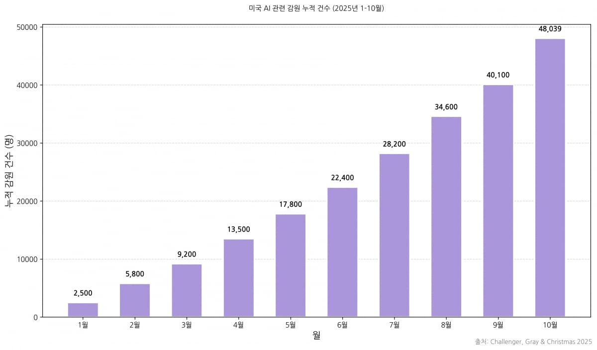 ‘AI 도입’과 ‘비용 절감’은 사실상 같은 의미로 쓰일 수도 있다. 기업들은 AI를 새로운 효율성의 도구로 바라보지만, 그 효율은 인력 감축이라는 결과로 이어졌다. 10월 감원 8만여 건 중 대부분이 이 두 사유와 관련된 것도 같은 맥락이다.
