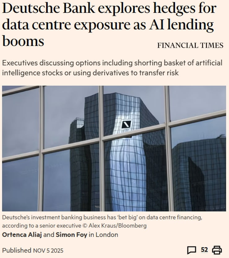 또 다른 뉴스의 주인공은 도이체방크였습니다. 파이낸셜타임스(FT)가 5일 수십억 달러 규모의 AI 데이터센터 대출을 보유하고 있는 도이체방크가 이 익스포저를 헤지(위험 회피)하기 위한 방안을 검토하기 시작했다고 보도한 겁니다. 도이체방크 역시 2008년 금융위기 이전 서브프라임 모기지의 부실을 예측해 해당 대출의 부도 위험만 판매하는 신용부도스왑(CDS)을 대규모로 만들어 팔았던 주역이죠.