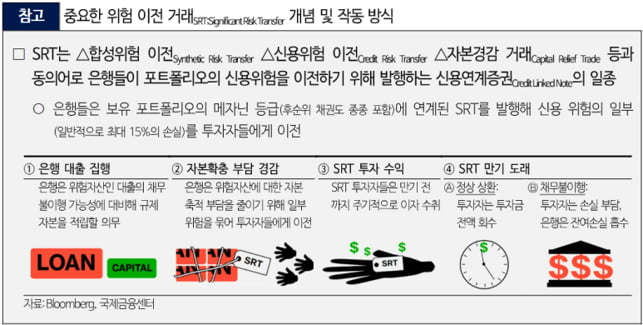 이뿐 아니라 SRT 시장이 커질 수록, 이 상품의 높은 수익률을 좇는 투자자가 늘어날 수록 합성되는 대출 자산의 품질이 나빠지고 투자자들은 신용 심사를 느슨하게 하는 도덕적 해이의 위험도 커질 수 있습니다. 서브프라임 모기지 사태 때 그랬듯이 말이죠.